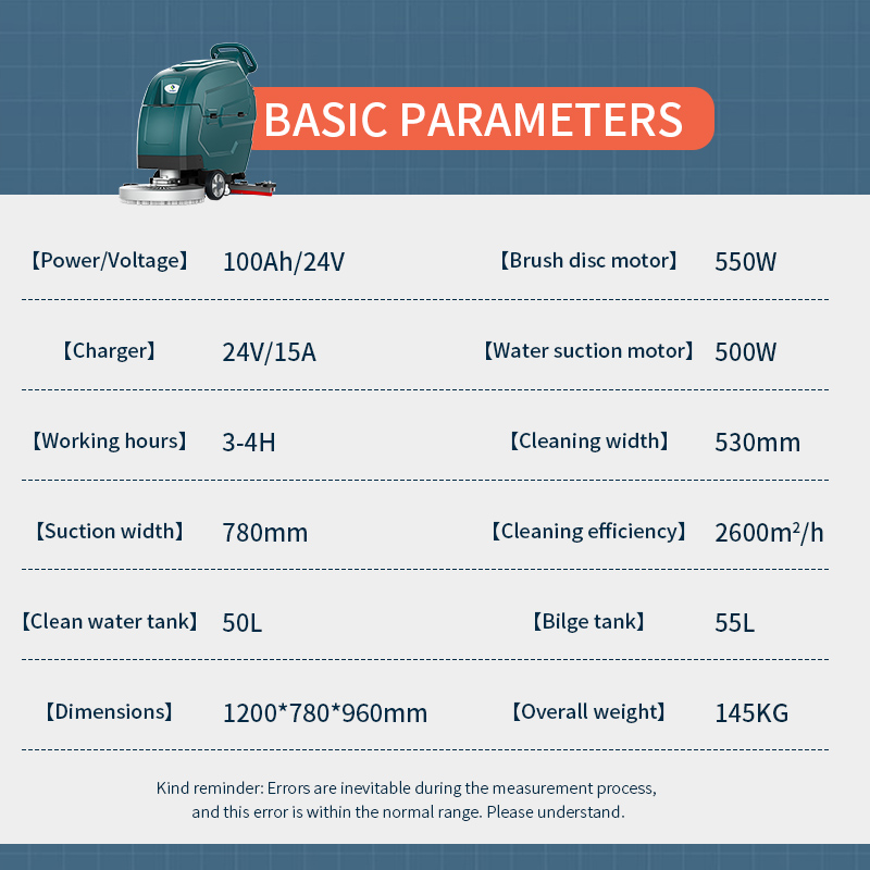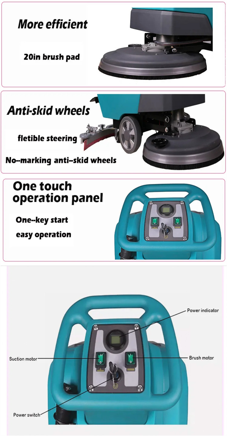 Powered by a robust motor, the scrubber delivers strong suction and brush rotation to effectively clean floors of various types and sizes. Its large cleaning width allows it to cover more ground in less time, saving valuable time and effort. Maintenance is also easy due to its simple design, which provides easy access to the brushes and other components.