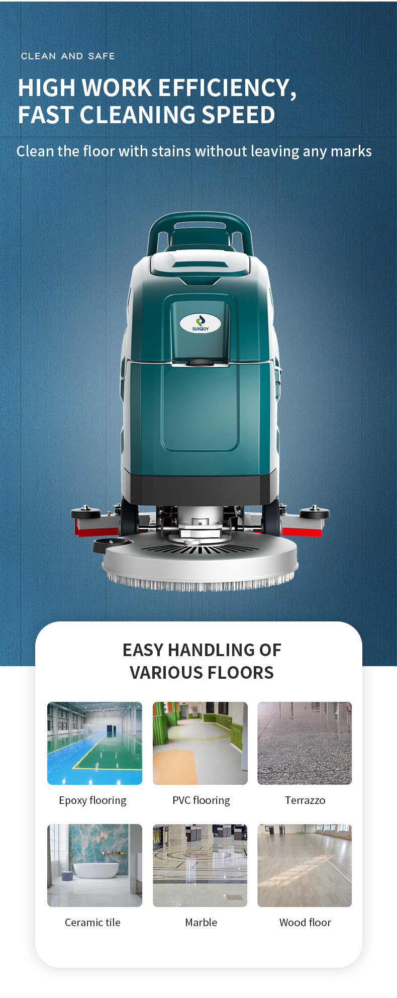 Equipped with an electric motor, this machine provides strong suction power to effectively remove dirt and debris from the floor surface.The walk-behind design allows for easy maneuverability,making it simple to cover large areas of flooring quickly and efficiently.