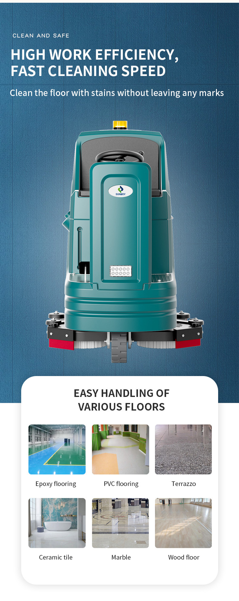 Hefei sunroy Industry Co.LTD is a professionalengaged in the research,development,sale and service of Walk behind floorscrubber,Ride-on floor scrubber,Sweeper,Vacuum cleaner.we have over 10 years of manufacturing experience and has produced a total of 400,000 cleaning equipment.we are ODM (original design manufacturer) for many well-known brands.business)factory.Our company currently has more than 300 employees and covers area of 40,000 square meters.Now own brands:Sunroy,accept OEM/ODM robot automatic scrubbers for industrial,commercial and home.You can switch it to autonomous mode and manual mode.Our knowledgeable sales staff is available to assist you to determine what products are right for your particular Performance or replacement parts application.