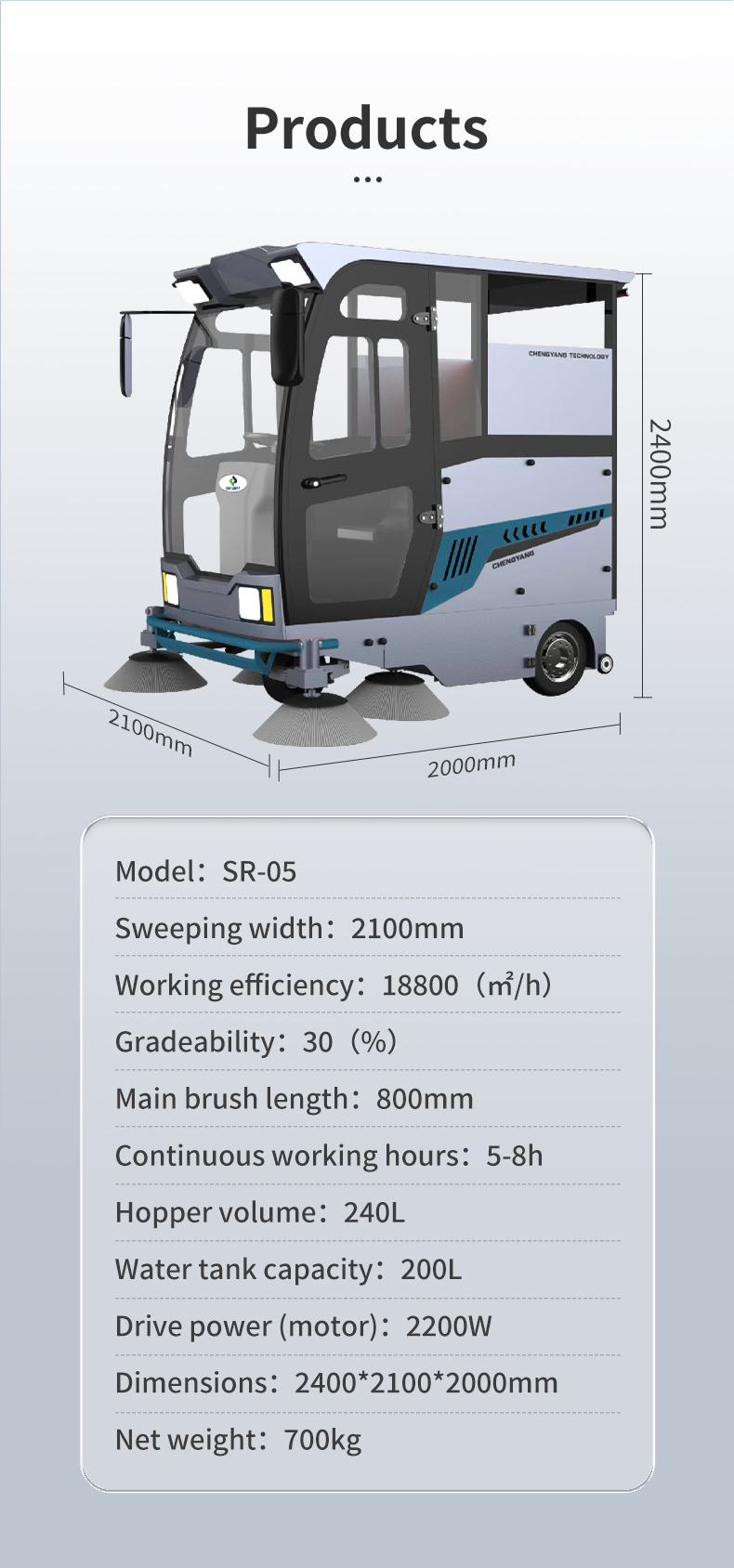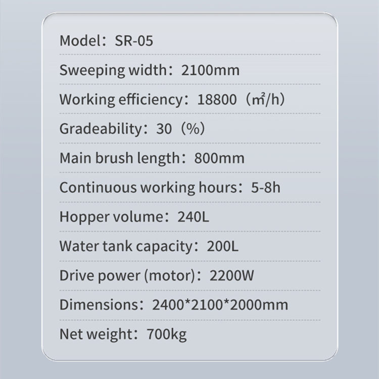 The Fully enclosed Ride On Floor Sweeper parameter.