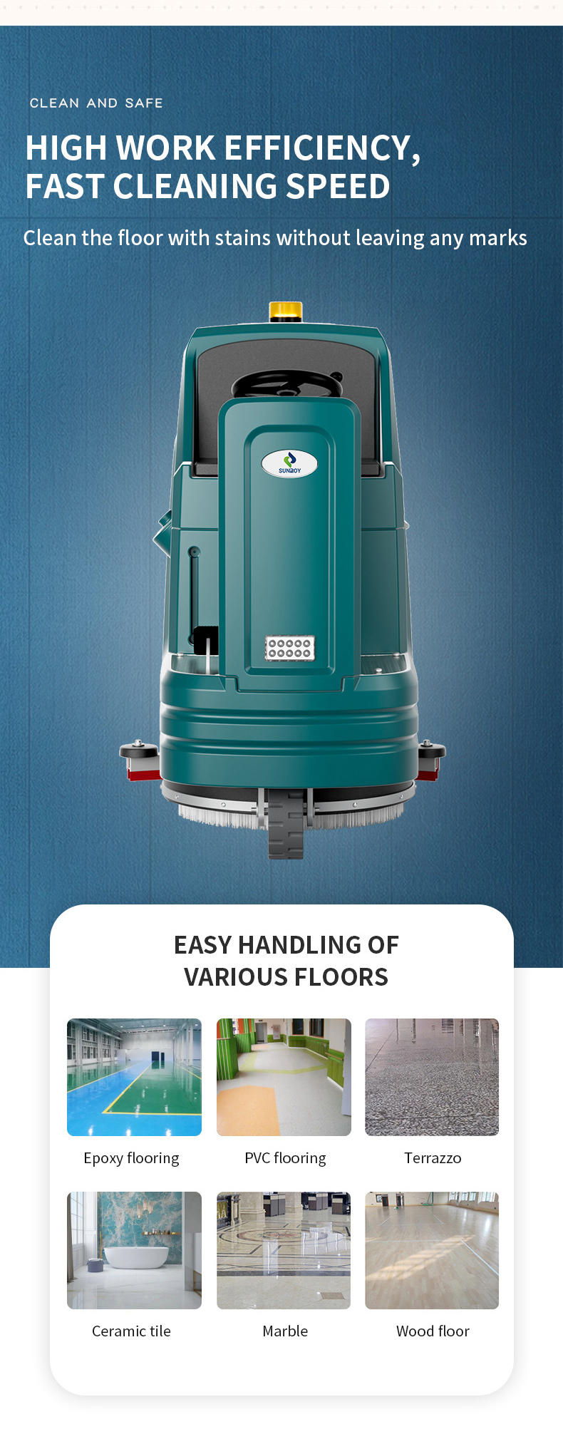 Hefei sunroy Industry Co.LTD is a professionalengaged in the research,development,sale and service of Walk behind floorscrubber,Ride-on floor scrubber,Sweeper,Vacuum cleaner.we have over 10 years of manufacturing experience and has produced a total of 400,000 cleaning equipment.we are ODM (original design manufacturer) for many well-known brands.business) factory.Our company currently has more than 300 employees and covers area of 40,000 square meters.Now own brands:Sunroy,accept OEM/ODM robot automatic scrubbers for industrial,commercial and home.You can switch it to autonomous mode and manual mode.Our knowledgeable sales staff is available to assist you to determine what products are right for your particular Performance or replacement parts application.